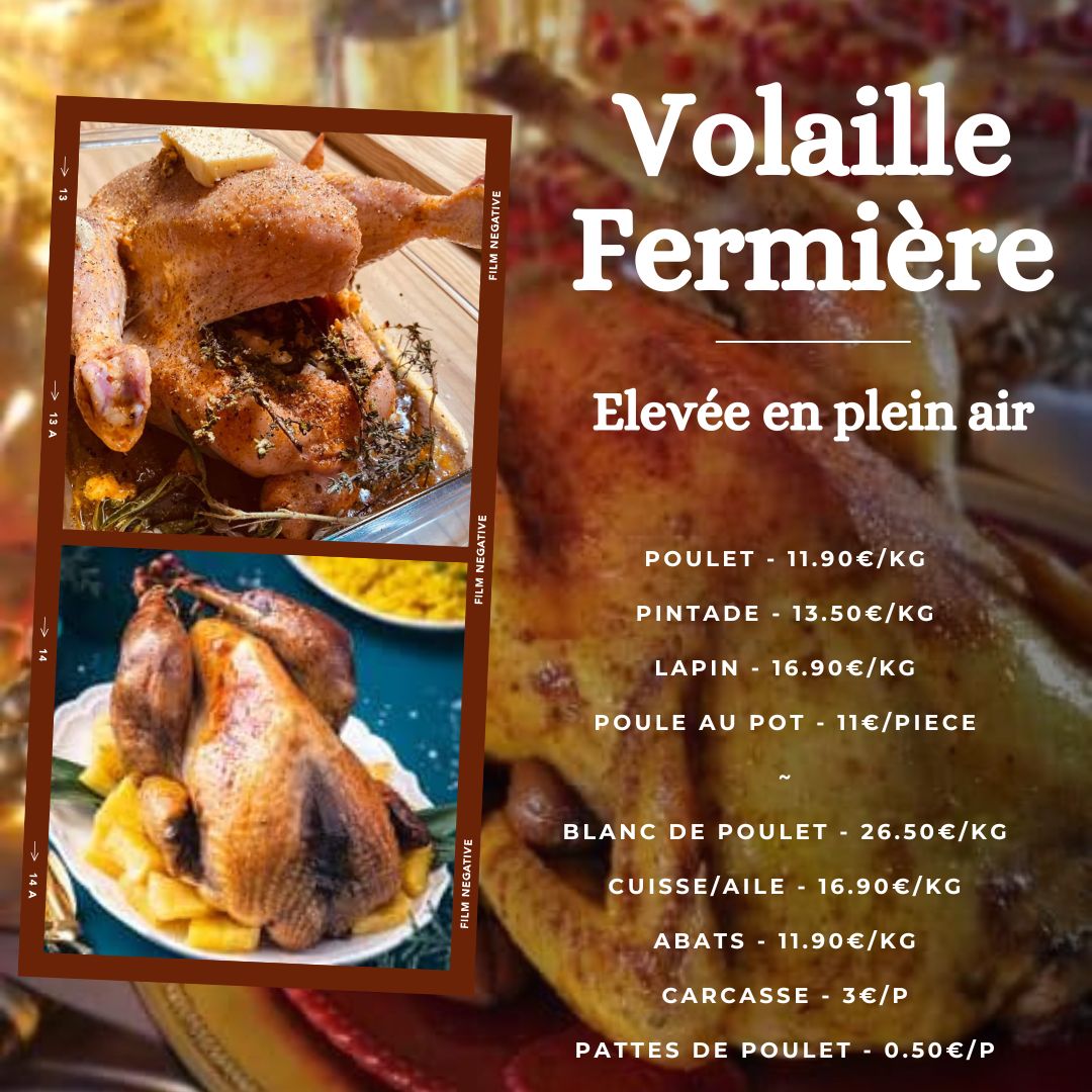 À la Basse Cour de la Plaine, je vous propose une large gamme de volailles prêtes-à-cuire, élevées avec soin en plein air : poulets fermiers, pintades, lapins, et bien sûr, chapons pour les fêtes.